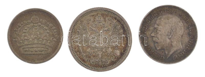 Description: Vegyes: Nagy-Britannia 1915. 3p Ag "V. György" + Orosz Birodalom 1916. 10k Ag + Svédország 1959. 10ö Ag T:VF,F