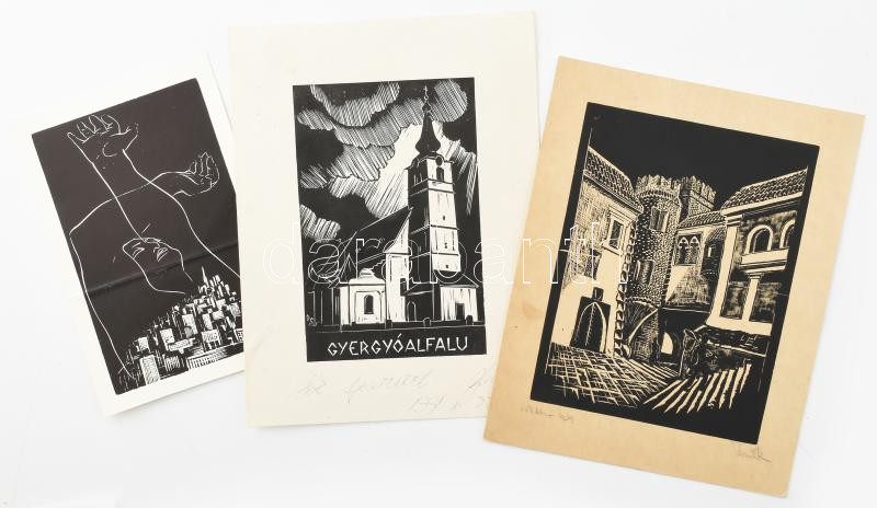 Description: 3 db metszet: Gyergyóalfalu, Itáliai városrészlet és alak a város felett, linó- vagy fametszet, papír, utolsó kivételével jelzett, utolsó törésnyommal, 15×9,5 és 16x12 cm közötti méretekben