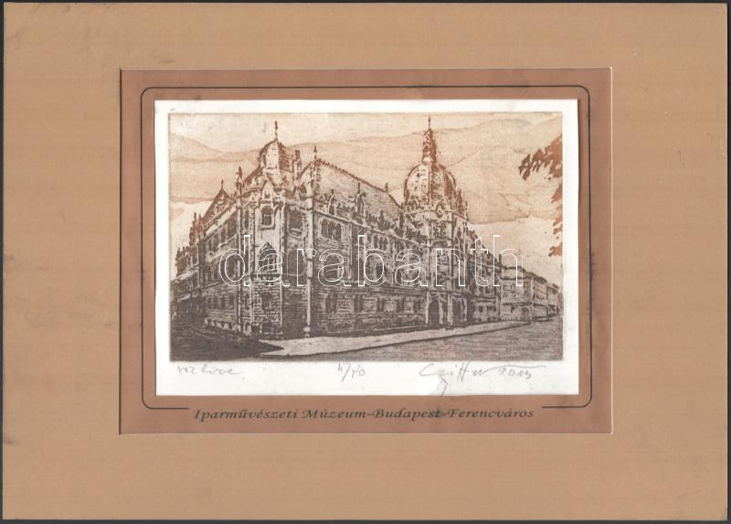 Description: Czitter (?) jelzéssel: Iparművészeti Múzeum, Budapest, Ferencváros. Rézkarc, papír, jelzett, számozott (4/50). A lapon kisebb sérüléssel, paszpartuban, 12x19 cm