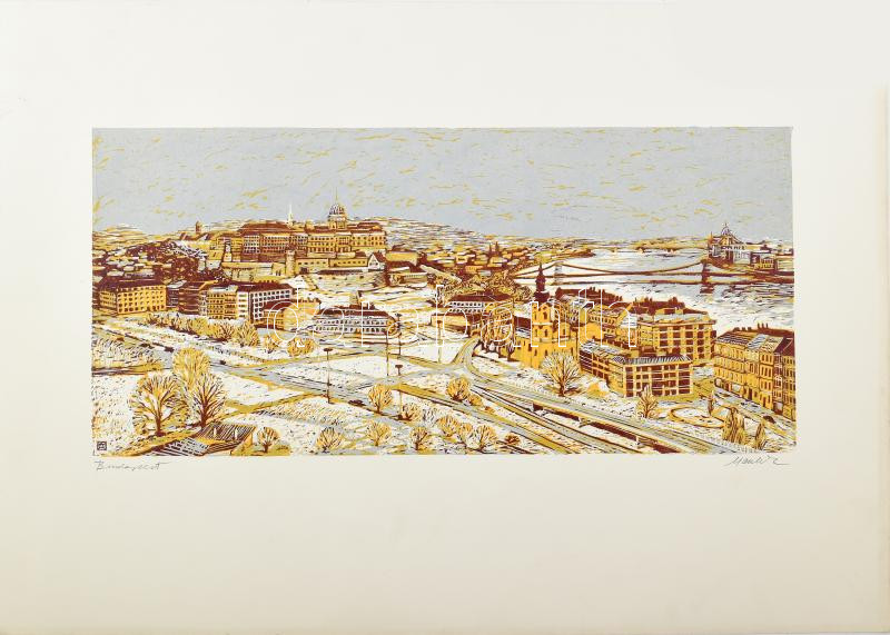 Csavlek András (1942- ): Budapest. Színes linómetszet, papír, jelzett, 26×55 cm