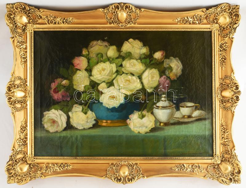 Dobay Ferenc (1867-?): Csendélet. Olaj, karton, jelzett. Dekoratív fakeretben, 70x50 cm.Kis sérüléssel