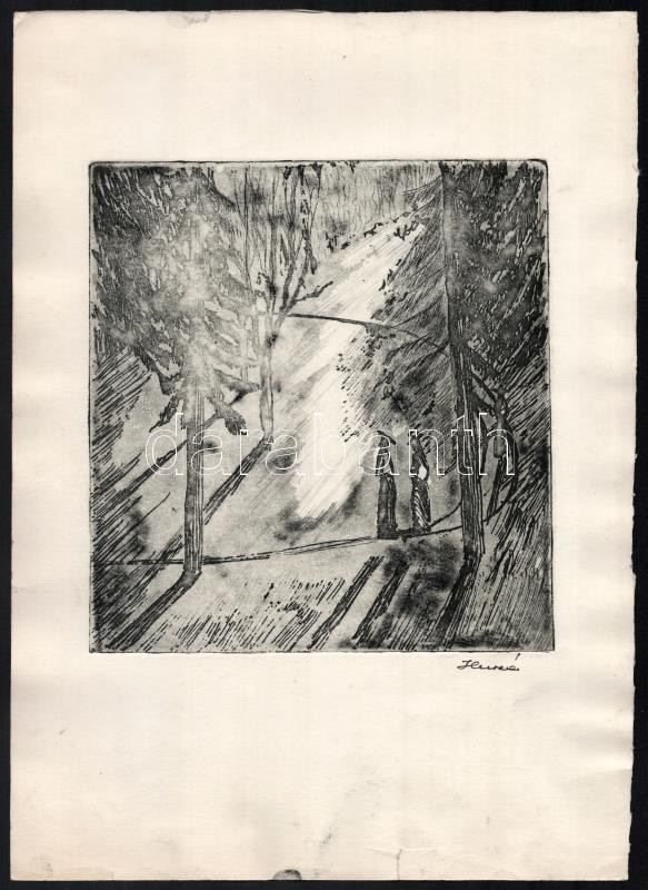 Huszár Gyula (?-): Erdei fény, rézkarc, papír, jelzett, lap széle foltos, lapszéli szakadás, 20×19 cm