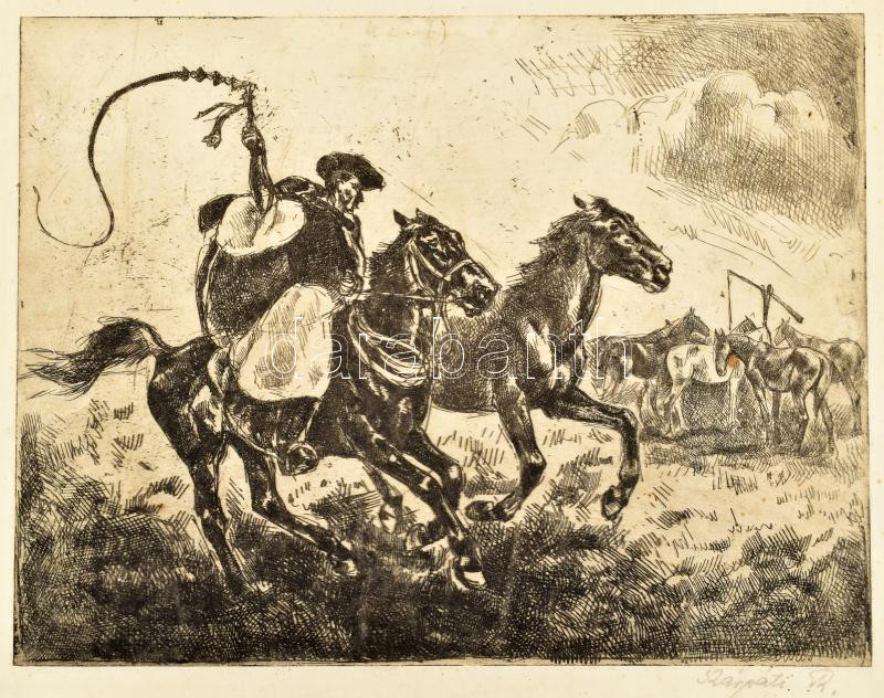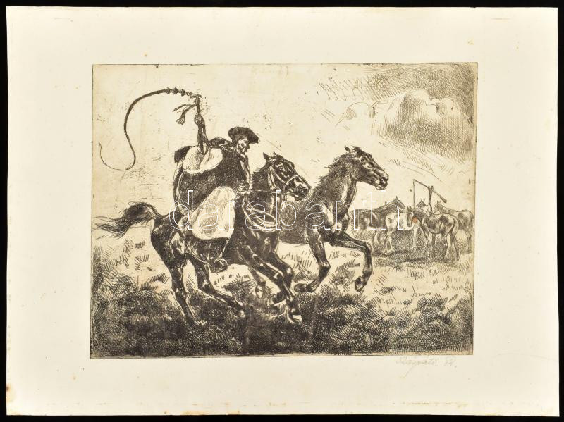 Kárpáti Rudolf (-): Csikós lovakkal. Rézkarc, papír Jelezve jobbra lent: Kárpáti R. 18x23 cm. Lap széle kissé foltos.