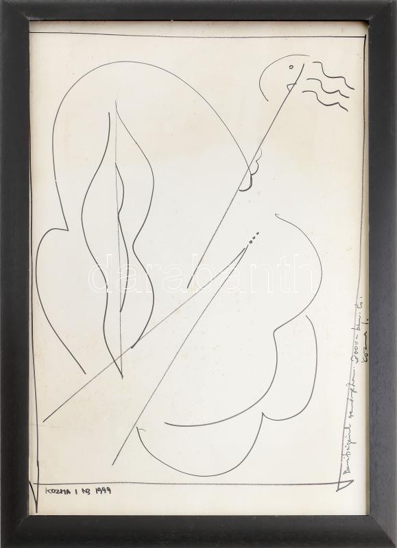 Kozma István (1937-2020): Női alak, 1999. Filctoll, papír, jelzett, Kozma István autográf dedikációjával, kissé foltos, üvegezett keretben. 55×39 cm.
