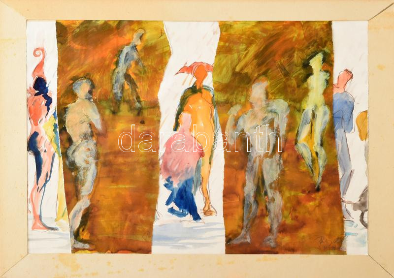 Szalay Pál (1953-2015): Társaság bohóccal. Vegyes technika, kollázs pa...