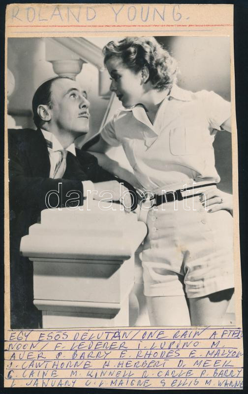 cca 1938 ,,Egy esős délután" című amerikai film egy jelenete (főszereplő Roland Young), 1 db vintage produkciós filmfotó, ezüst zselatinos fotópapíron, Pánczél György (1920-?) filmtörténész hagyatékából (film- és színházifotó gyűjteményéből), rajzlapra felragasztva, saját kézírásával kiegészítve, a használatból eredő, esetleges kisebb hibákkal, 21x16 cm