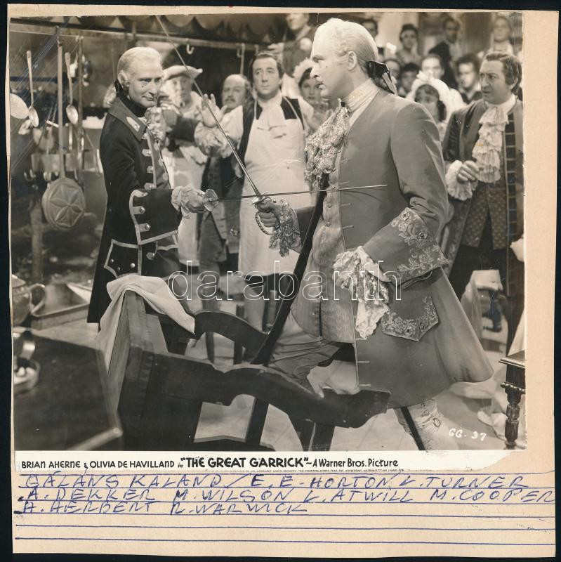 cca 1939 előtti ,,Gáláns kaland - The Great Garrick"" című amerikai film egy jelenete, 1 db vintage produkciós filmfotó, ezüst zselatinos fotópapíron, Pánczél György (1920-?) filmtörténész hagyatékából (film- és színházifotó-gyűjteményéből), rajzlapra felragasztva, a használatból eredő - esetleges - kisebb hibákkal, saját kézírásával kiegészítve, + hozzáadva a hátoldalra ragasztott vintage fotót ,,Blackwell's Island" című filmből, 17x18 cm