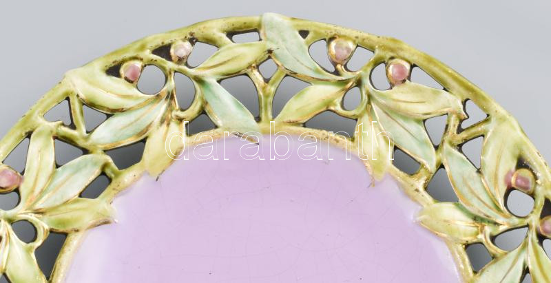 4 darab szecessziós mázas fajansz tányér, áttört növényi mintákkal dís...