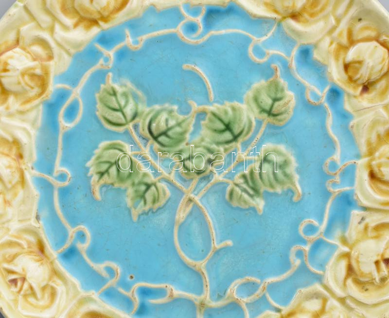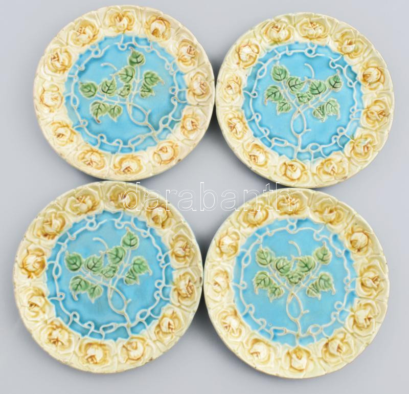 4 darab szecessziós mázas fajansz tányér, növényi mintákkal díszítve, ...