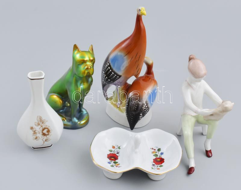 5 darabos magyar porcelán tétel: Hollóházi madarak, váza, Kalocsai sóborskínáló, Aquincum macival játszó lány, Zsolnay eozin buldog (ennek füle ragasztott).
