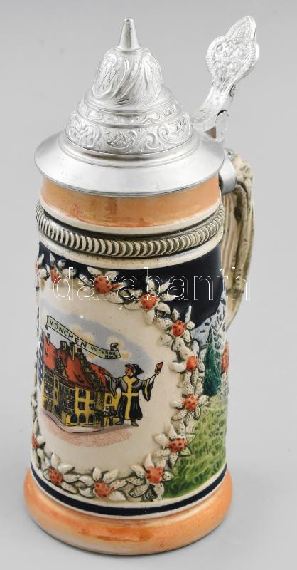 Bay német söröskorsó, ón fedéllel, jelzéssel, hibátlan, m: 19 cm