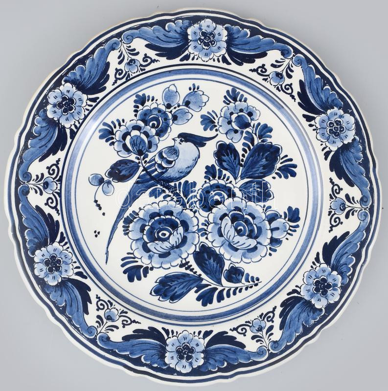 Delfti kék paradicsommadár mintás holland dísztál, jelzéssel, akasztható, kis kopottsággal, d: 25 cm