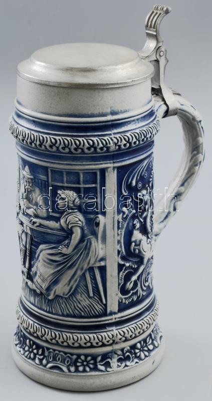 Gerzit zsánerjelenetes steinzug söröskorsó, ón fedéllel, jelzéssel, hibátlan, m: 26,5 cm
