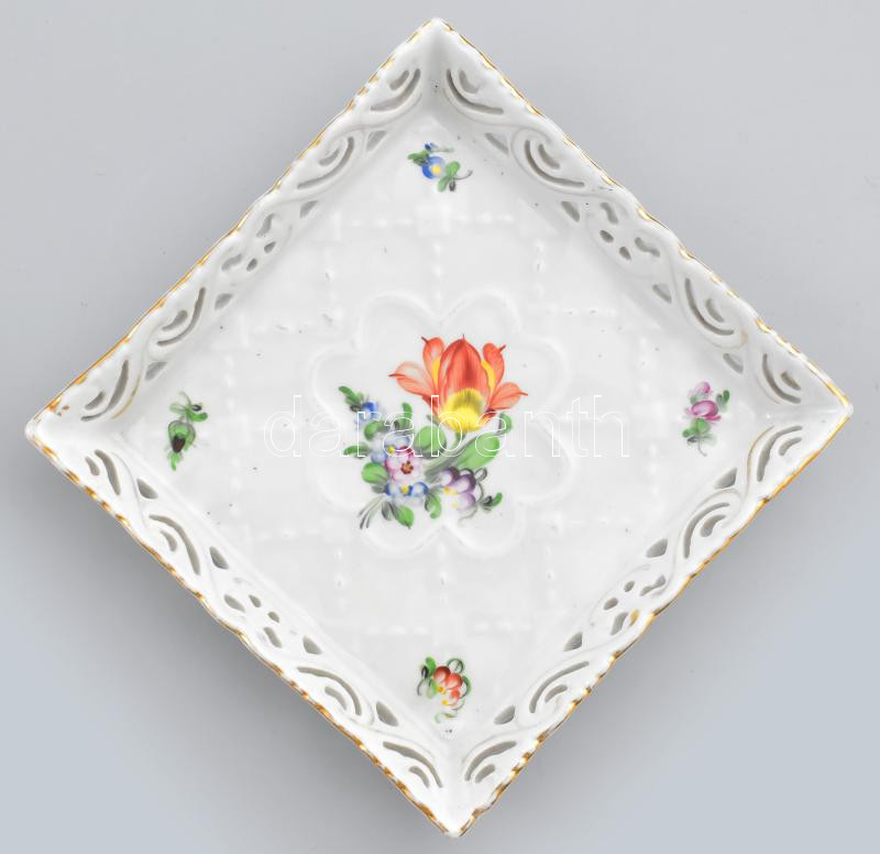 Herendi négyoldalas virágmintás kínáló, áttört mintával, kézzel festett, 3. oszt. jelzéssel, kopással, 15x15 cm