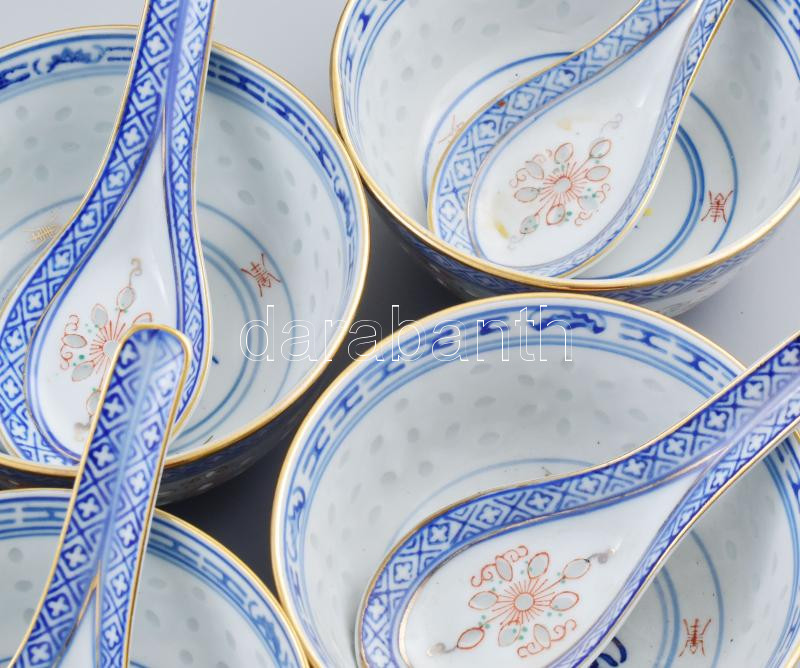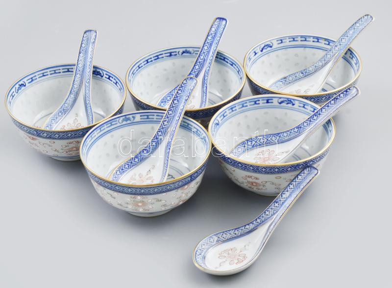 Kínai leveses tál kanállal szett, 5 db tál és 6 db kanál, többféle mintával, jó állapotban