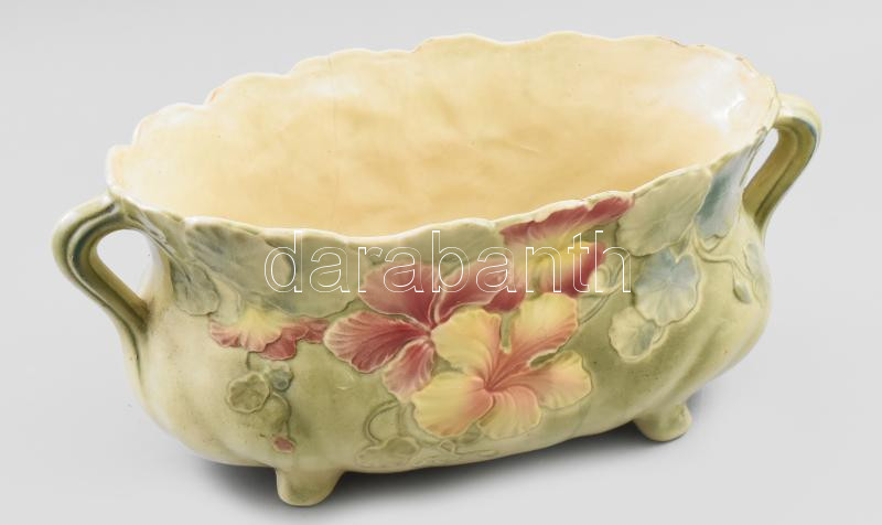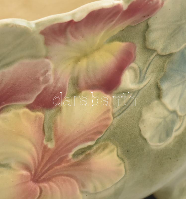 Szecessziós majolika kínáló, körben virágmintákkal ékesített, jelzéssel, hajszálrepedéssel, 36x19x15 cm
