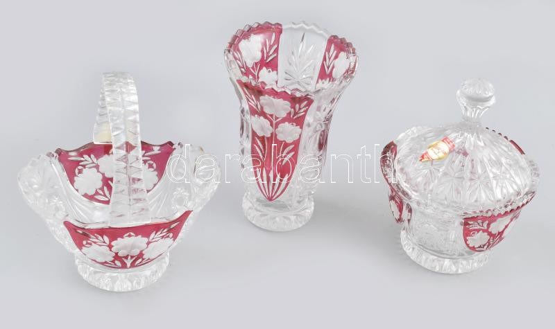 Anna Hütte kristály asztali szett: bonbonier, váza, kosár kínáló. Címkével jelezve, hibátlan, m: 16-17 cm