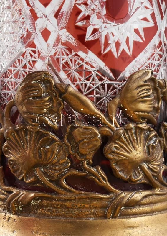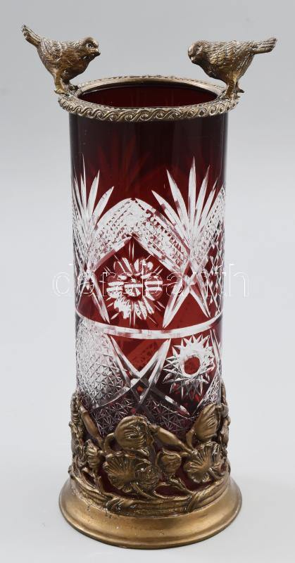 Antik csiszolt bordó kristályüveg váza, madár figurákkal és növényi ornamentikával díszített bronz szerelékkel, hibátlan, m: 26 cm