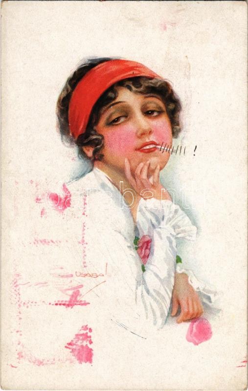 1919 Lady smoking a cigarette. Italian art postcard. "ERKAL" No. 303/5. s: Usabal