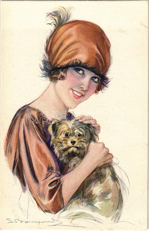 Olasz hölgy kutyával / Italian lady art postcard with dog s: Bompard