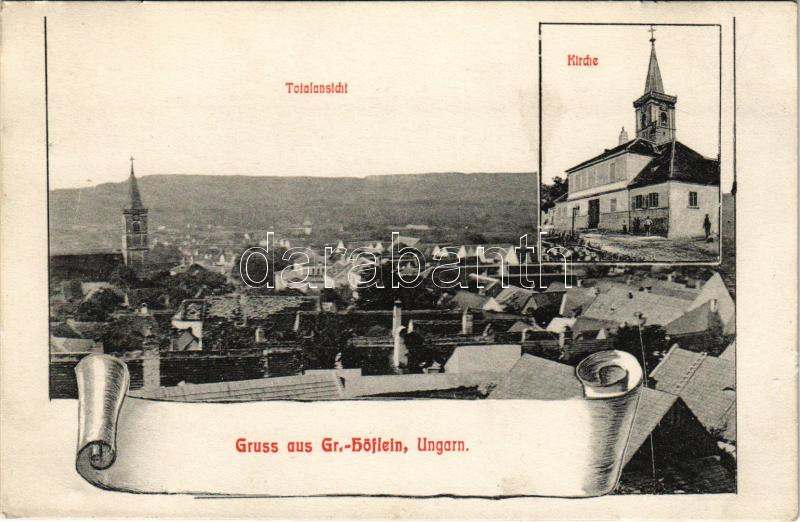 1909 Nagyhöflány, Grosshöflein, Großhöflein; Totalansicht, Kirche / látkép, templom. M. Gassner kiadása / general view, church