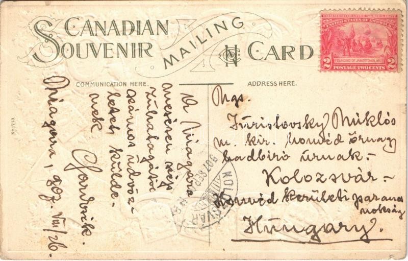 Description: 1907 Horseshoe Falls from Canadian Park, Niagara Falls. Border of Ontario, Canada, and New York, United States. Coats of arms of the Canadian Provinces. Art Nouveau, Floral, Emb. litho (small tear)
