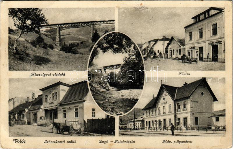1941 Volóc, Volovec, Volovets; Kisszolyvai viadukt, vasúti híd, Fő utca, Cikta üzlet, Szövetkezeti szálló, MÁV pályaudvar, vasútállomás. Márton Jenő felvételei / railway bridge, viaduct in Skotarska, main street with shops, hotel, railway station (felületi sérülés / surface damage)
