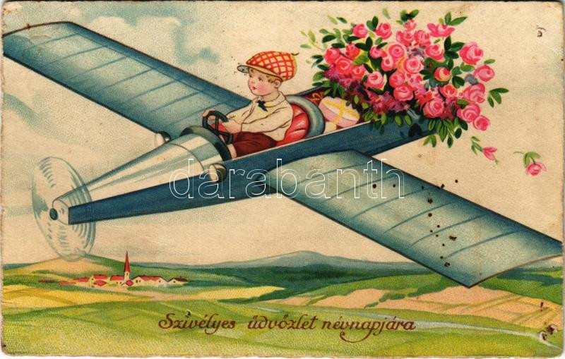 Szívélyes üdvözlet névnapjára / Name Day greeting card with pilot, airplane and flowers (lyukak / pinholes)