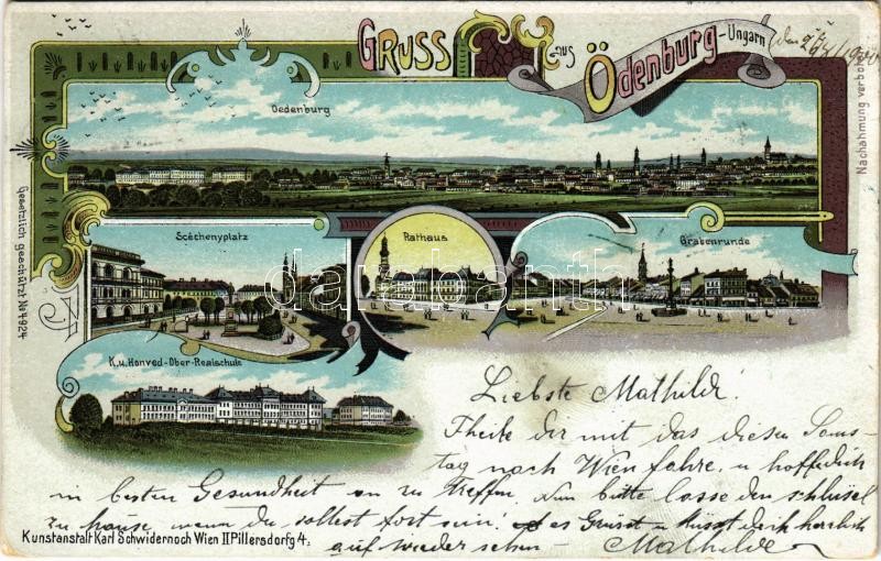 Description: 1900 Sopron, Ödenburg; Széchenyi tér, Városház, Várkerület, Cs. és kir. Honvéd felső reáliskola. Kunstanstalt Karl Schwidernoch Art Nouveau, floral, litho (EK)