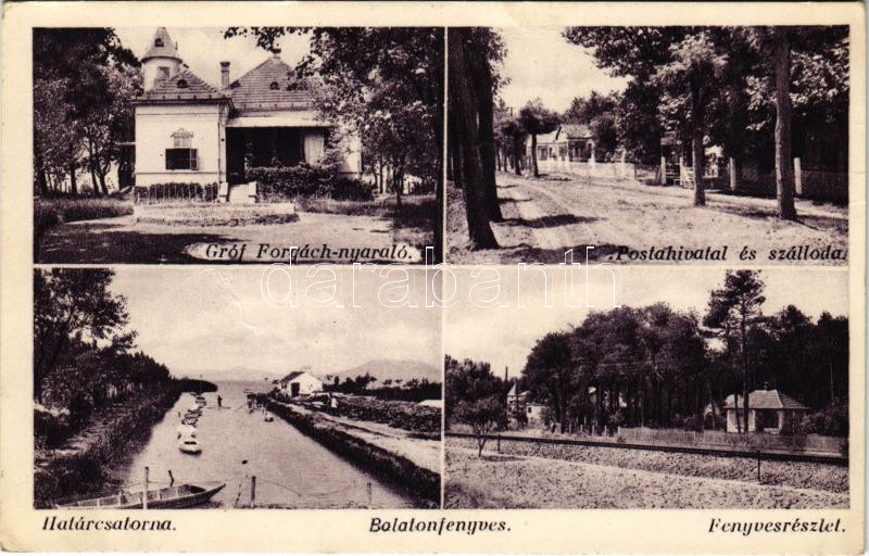 Balatonfenyves, Gróf Forgách nyaraló, Postahivatal és szálloda, Határcsatorna, Fenyves részlet (fa)