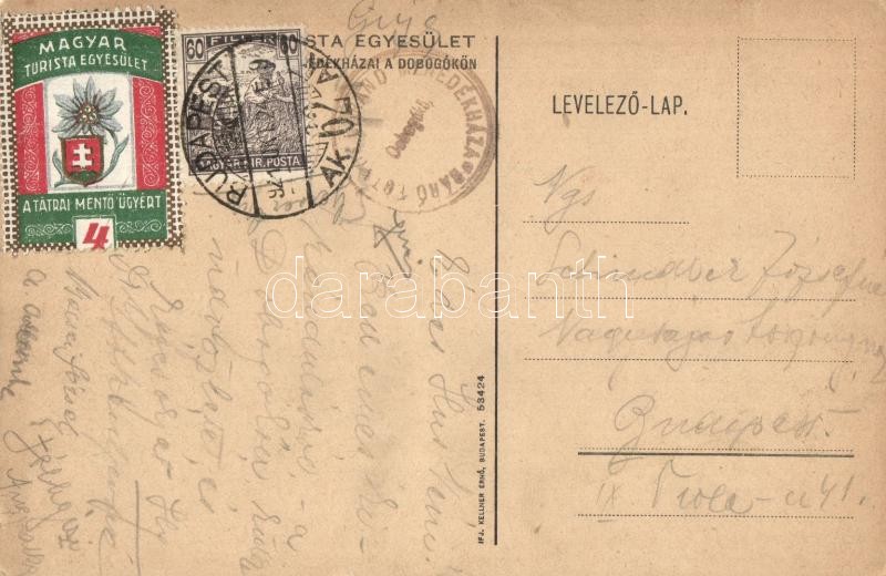 Dobogókő, Magyar Turista Egyesület báró Eötvös Loránd menedékháza. Silberer felvétele + "Magyar Turista Egyesület a Tátrai Mentő Ügyért" bélyeg