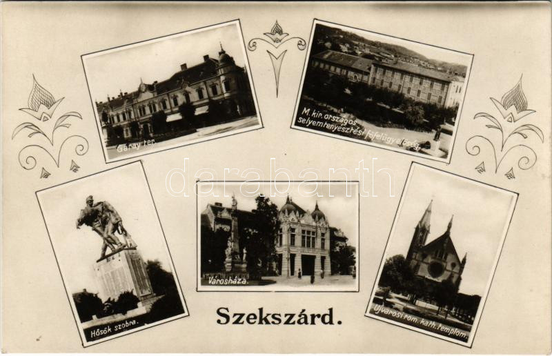 Szekszárd, Garay tér, M. kir. országos selyemtenyésztési főfelügyelőség, Hősök szobra, emlékmű, Városháza, Újvárosi római katolikus templom
