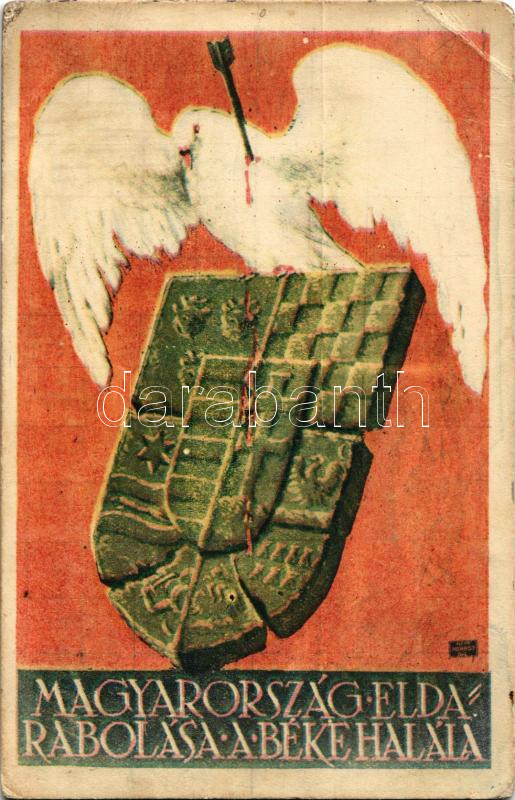 Description: Magyarország eldarabolása a béke halála. Kiadja a "Szózat" Magyarország Területi Épségének Védelmi Ligája napilapja / Hungarian irredenta propaganda, Hungarian coat of arms, Trianon s: Tábor János, Dankó Ödön (EB)
