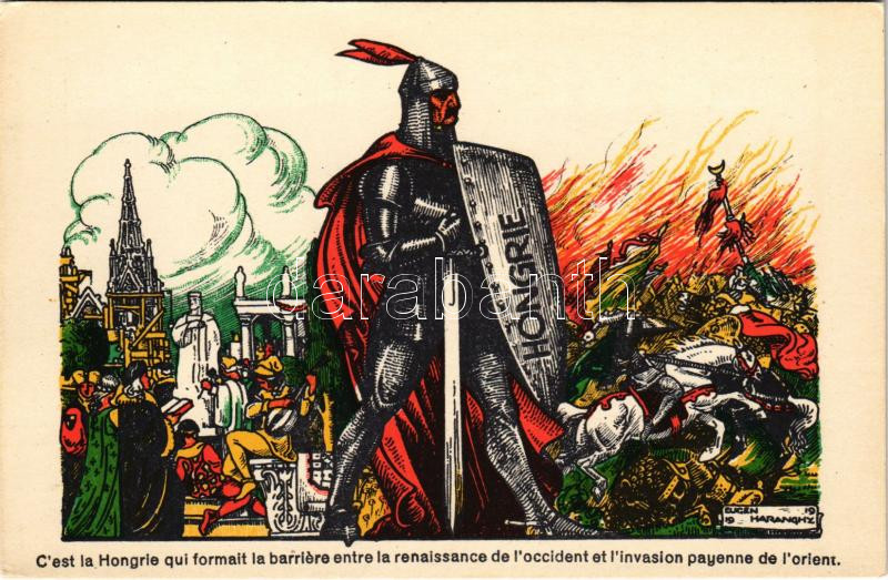 Description: Magyarország volt a gát a nyugati renaissance s a pogány invázió közt / Hungarian irredenta art postcard in French, Treaty of Trianon, propaganda s: Eugen Haranghy (EK)