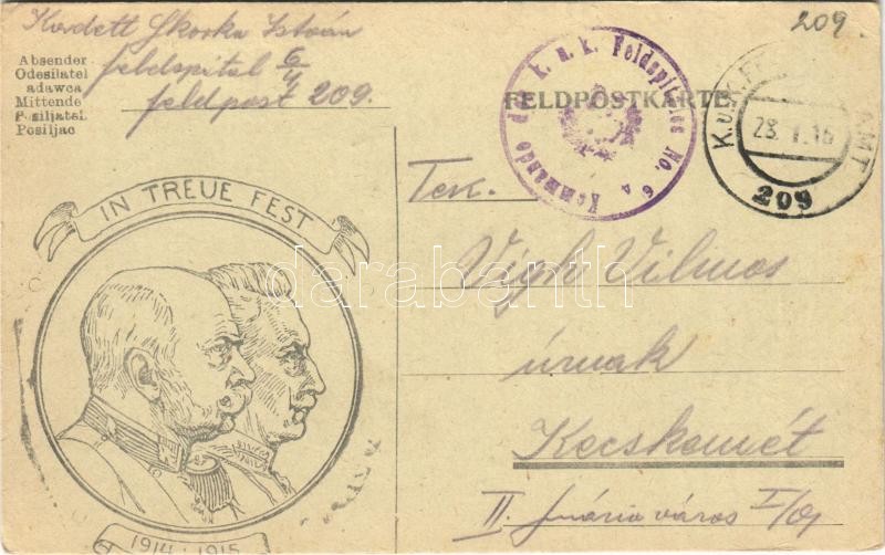 Description: 1916 In Treue Fest 1914-1915 / WWI Austro-Hungarian K.u.K. military field postcard, Viribus Unitis propaganda with Franz Joseph I of Austria and Wilhelm II + "K.u.K. Feldspitales No. 6/4. Kommando" (EK)