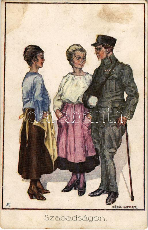 1917 Szabadságon. osztrák-magyar sérült katona / WWI K.u.K. military art postcard with injured soldier s: Géza Lippay (kis szakadás / small tear)
