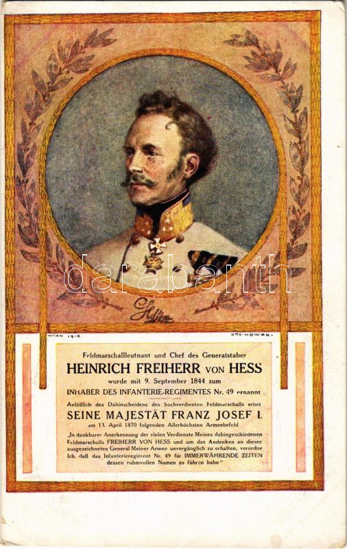 Description: Heinrich Freiherr von Hess. Der Ertrag fließt dem Invalidenfonds des k.u.k. Inf.-Reg. Nr. 49. Freih. v. Heß zu / Heinrich von Heß, Austrian field marshal. WWI K.u.K. military art postcard s: Otto Nowak (EK)