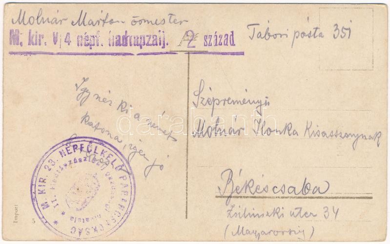 Description: Kämpfe auf der Landstraße nach Luneville / Harcok a német-francia határon / WWI German military art postcard, battle with the French. + "M. kir. V/4. népf. hadtápzászlóalj 2. század" "M. kir. 23. népfölkelő parancsnokság II. hadtápzászlóalj gazdasági hivatala" (EK)