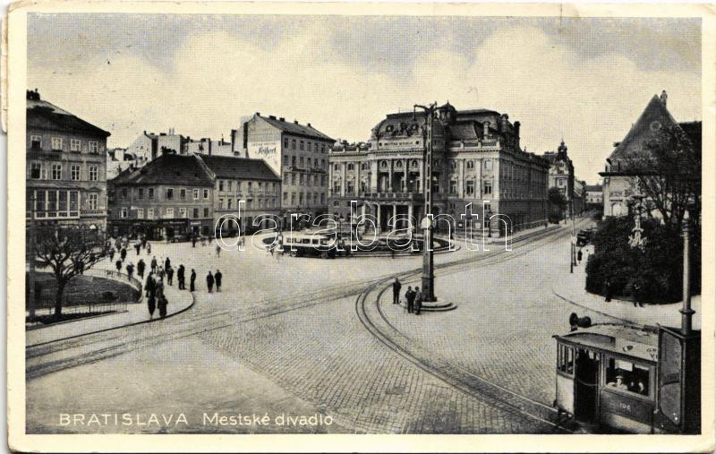1936 Pozsony, Pressburg, Bratislava; Mestské divadlo / színház, autóbusz, villamos, üzletek / Stadttheater / theatre, autobus, tram, shops (EK)
