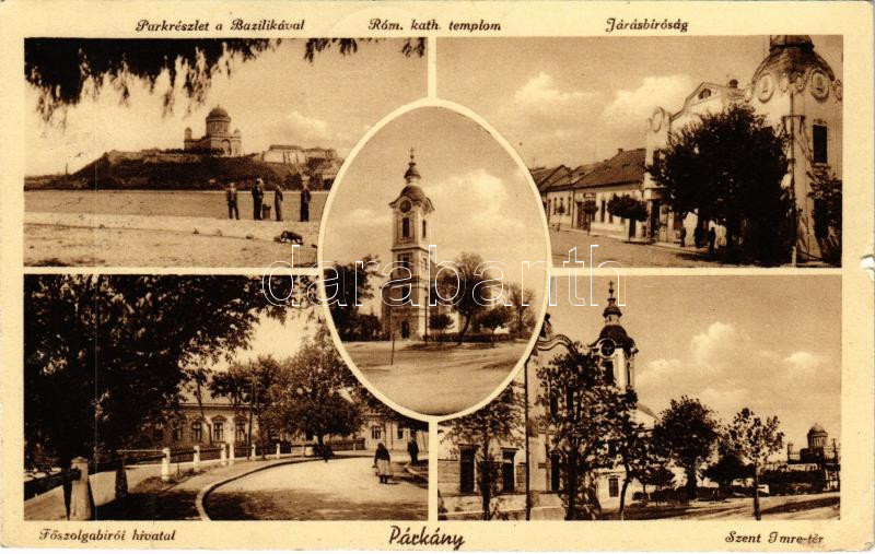 1939 Párkány, Stúrovo; park és Bazilika, Római katolikus templom, Főszolgabírói hivatal, Járásbíróság, Szent Imre tér / park, cathedral, church, courts, square (EK)