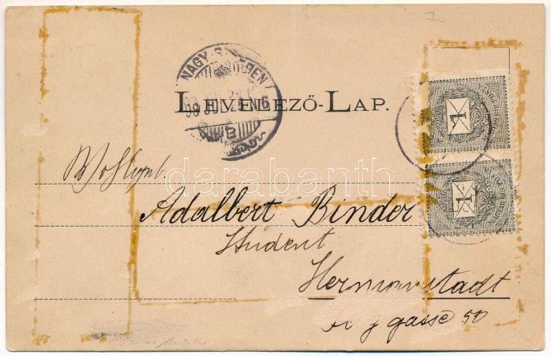1898 (Vorläufer) Oravicabánya, Oravica, Oravicza, Oravita; Marktplatz, Röm. kath. Kirche, Comunal Bürgerschule, Montanbahn Krasova Tunel, Aerarische Amts-Gebäude / Piactér, Római katolikus templom, Polgári iskola, Hegyi vasút alagútja Krassóvárnál, Kincstári hivatalok épülete. Kehrer kiadása / market square, Catholic church, school, mountain railway tunnel near Carasova. Art Nouveau, floral (ragasztónyom / glue marks)