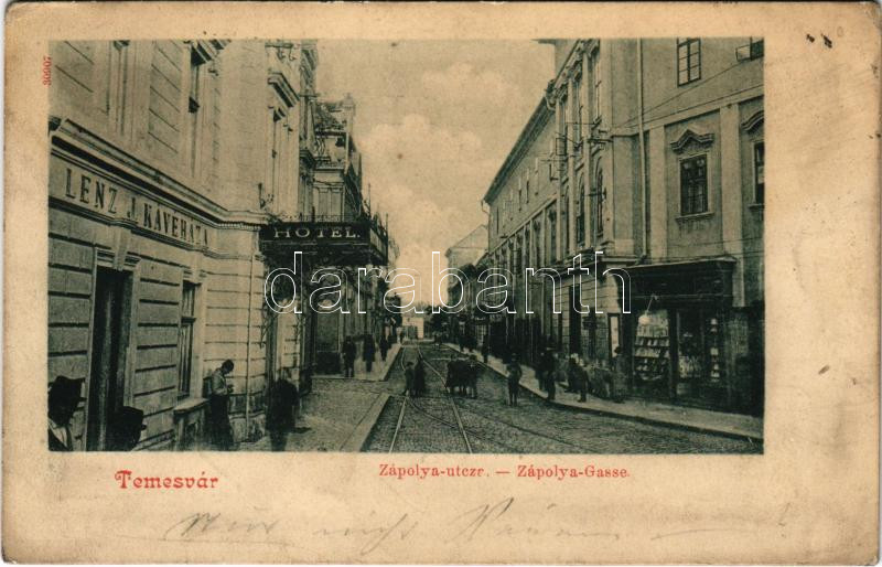 1901 Temesvár, Timisoara; Zápolya utca, Lenz J. kávéháza, szálloda, üz...