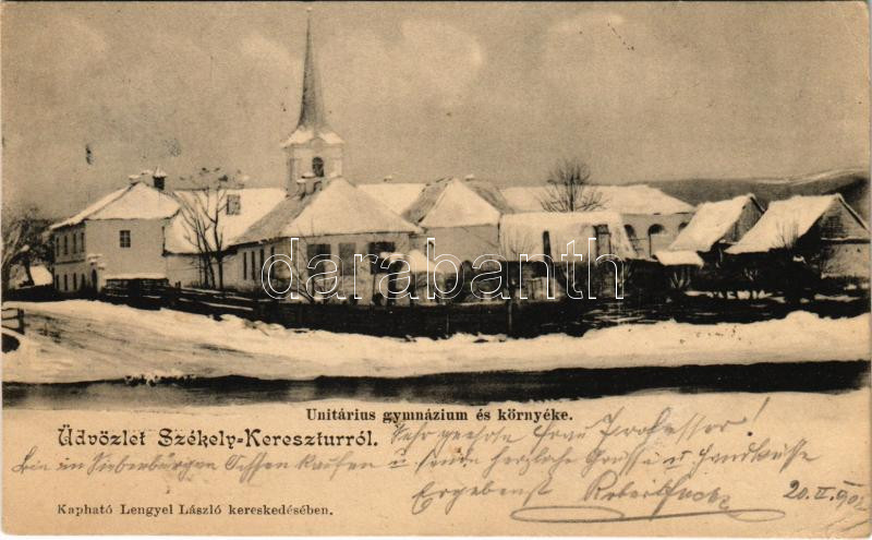 1902 Székelykeresztúr, Cristuru Secuiesc; Unitárius gimnázium és környéke télen. Lengyel László kiadása / Unitarian grammar school in winter (EK)