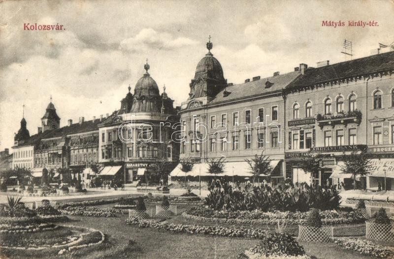 1912 Kolozsvár, Cluj; Mátyás király tér, Erdélyi Bank, Drogéria, biztosító társaság, Haraszthy J. üzlete / square, Transylvanian bank, drogerie, insurance company, shops (EK)