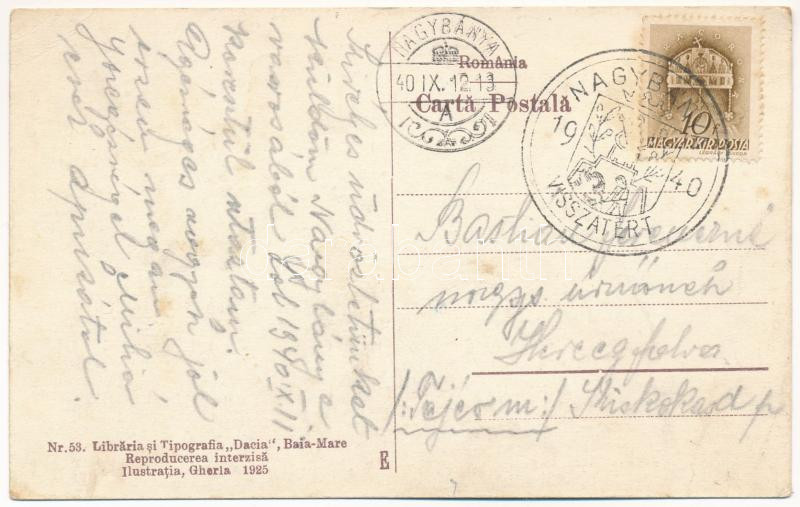 1940 Nagybánya, Baia Mare; vasútállomás, vonat, gőzmozdony / Gara / railway station, train, locomotive + "1940 Nagybánya visszatért" So. Stpl. (EB)