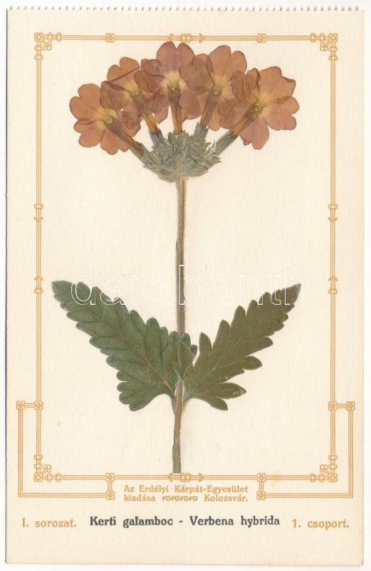 Kolozsvár, Cluj; Erdélyi Kárpát Egyesület kiadása I. sorozat 1. csoport. Kerti galamboc, élővirágos. Ifj. L. Bodor László növény- és virágpreparáló műintézete, valódi préselt virágos levelezőlap gyára Kolozsvár / Verbena hybrida / Vervain real flower