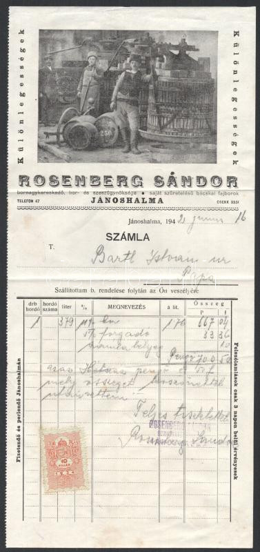 1942 - Jánoshalma Rosenberg Sándor bornagykereskedő, bor- és szeszügynöksége saját szüretelésű bácskai borok, fejléces számla