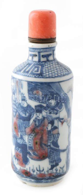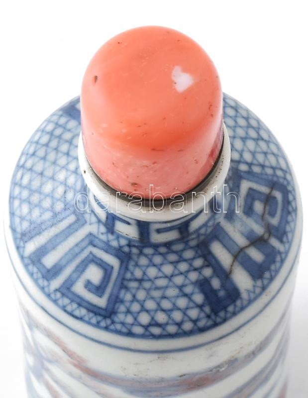 Kínai máz alatti kék-fehér porcelán tubákos üvegcse, korall kupakkal, ...