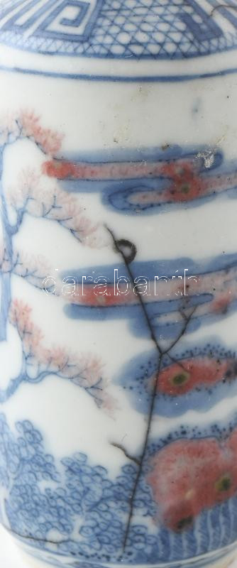 Kínai máz alatti kék-fehér porcelán tubákos üvegcse, korall kupakkal, m: 10,5 cm