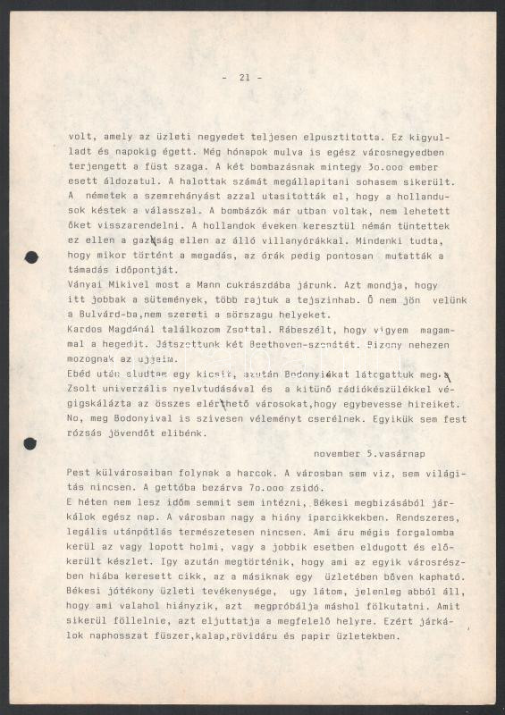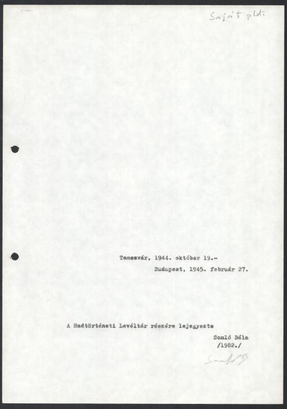 1982 Somló Béla: Munkaszolgálatos naplóm. Temesvár, 1944. október 19. - Budapest, 1945. február 27. A Hadtörténeti Levéltár részére lejegyezte: - - . Autográf aláÃrással ellátott, gépelt szerzÅ‘i kézirat. PapÃrmappában lefűzve (a mappa kissé sérült), 73 p.